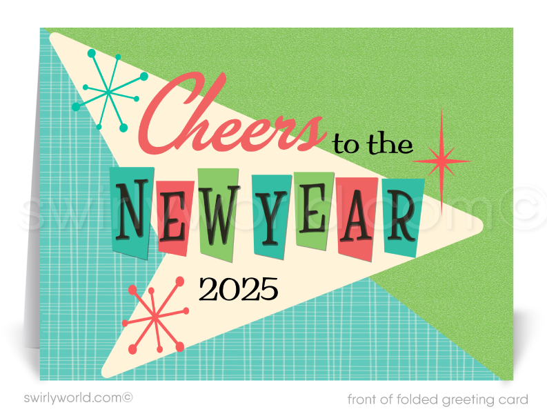 Step into the charm of the past with our Retro Mid-Century Modern Happy New Year Greeting Cards. Embracing the vibrant aesthetics of the 1950s-1960s, these cards feature dazzling starbursts, retro typography, and iconic MCM colors with boomerang shapes, making them the perfect choice for those who appreciate the timeless style of the atomic era.