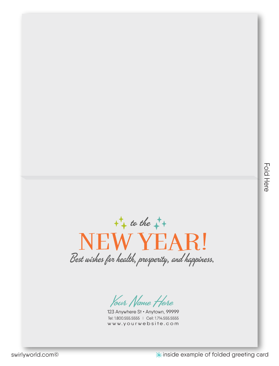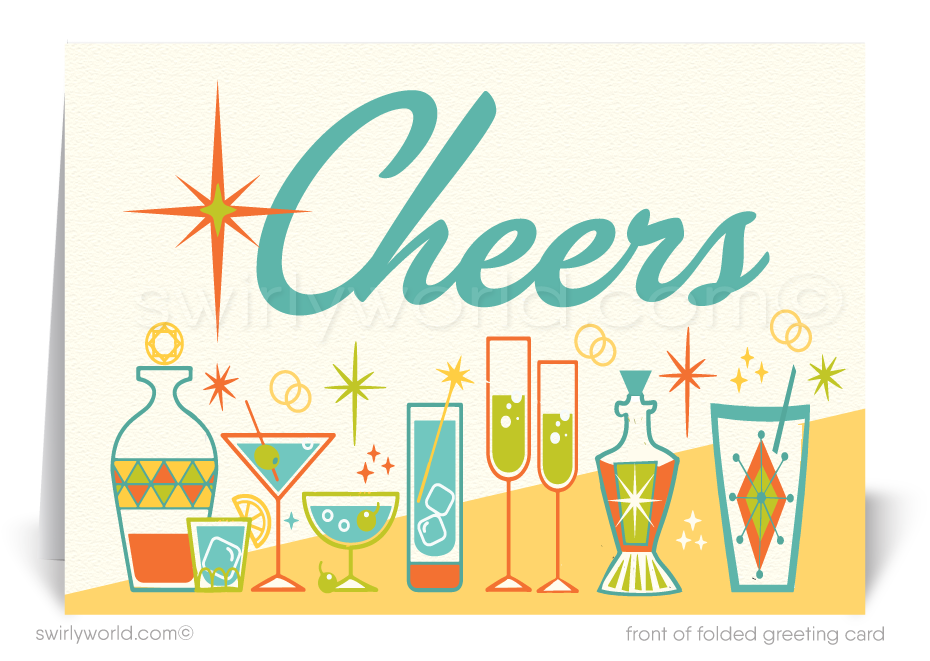 Celebrate the New Year in style with our Retro Mid-Century Modern Cocktail-Themed Happy New Year Greeting Cards. Capturing the vibrant aesthetics of the 1950s and 1960s, these cards showcase authentic starbursts and retro typography, making them a perfect choice for anyone who loves the timeless charm of the atomic era. This exclusive design features a retro-inspired collection of vintage liquor bottles with the word "Cheers" prominently displayed in bold, retro-style typography. The classic MCM color palette of orange, teal, green, and yellow, paired with sparkling starbursts, completes this nostalgic and sophisticated look.