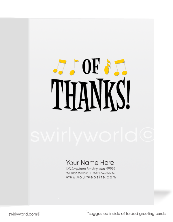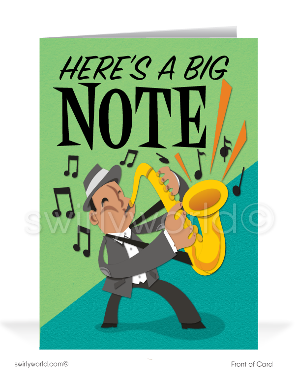 A stylish jazz musician plays a saxophone, with musical notes emanating outward, on the image of this thank you card. Printed and delivered to your doorstep!