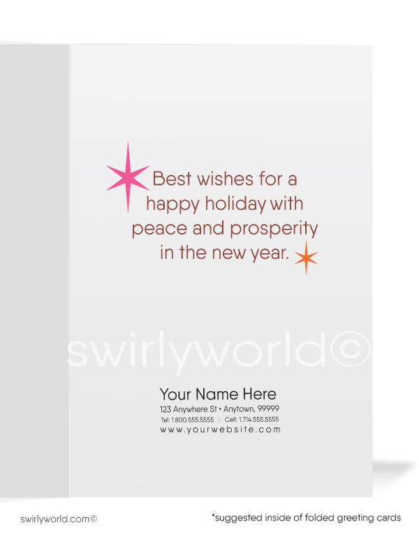 Our cards pop with authentic mid-century typography that brings the retro vibe to life, adding a one-of-a-kind charm to your holiday greetings. Make it personal with a custom message on these unique cards and envelopes for a warm, memorable touch. Printed on premium matte stock, these cards are all about quality and aesthetic, ready to impress.