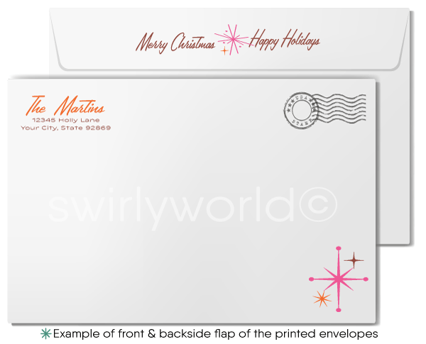 Choose between a sleek single-panel flat card or a classic folded option for a timeless look. Both come with matching white envelopes, with an option to upgrade to custom imprinted envelopes featuring your name, return address, and coordinating design elements. Let these distinctive, retro holiday cards make a lasting impact and elevate your holiday greetings.