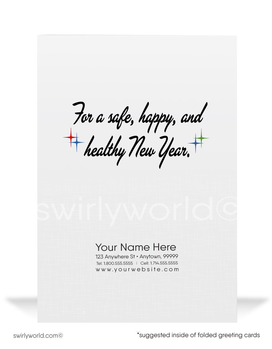 Embrace the glamour and charm of mid-century modern design with our Vintage 'Cheers' Happy New Year Greeting Card! This stylish card sets the perfect tone for celebrating the New Year, showcasing a beautifully illustrated champagne glass, vibrant streamers, festive balloons, and retro atomic starbursts. All set against a rich deep blue backdrop, it’s a stunning tribute to timeless elegance and joy.