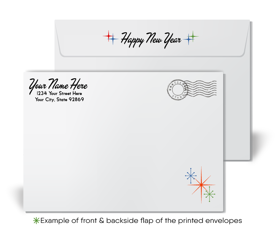 Choose between a sleek single-panel flat card or a classic folded option for a timeless look. Both come with matching white envelopes, with an option to upgrade to custom imprinted envelopes featuring your name, return address, and coordinating design elements. Let these distinctive, retro holiday cards make a lasting impact and elevate your holiday greetings.