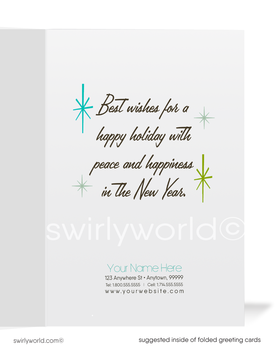 Take a trip back in time with our exclusive vintage holiday card, capturing all the warmth and nostalgia of days gone by. This unique design pays tribute to classic Mid-Century Modern (MCM) style, offering a delightful glimpse into the essence of the season. Featuring sleek atomic-style blue and green trees with starbursts and snowflakes, this card embodies the timeless charm of a true mid-century motif.