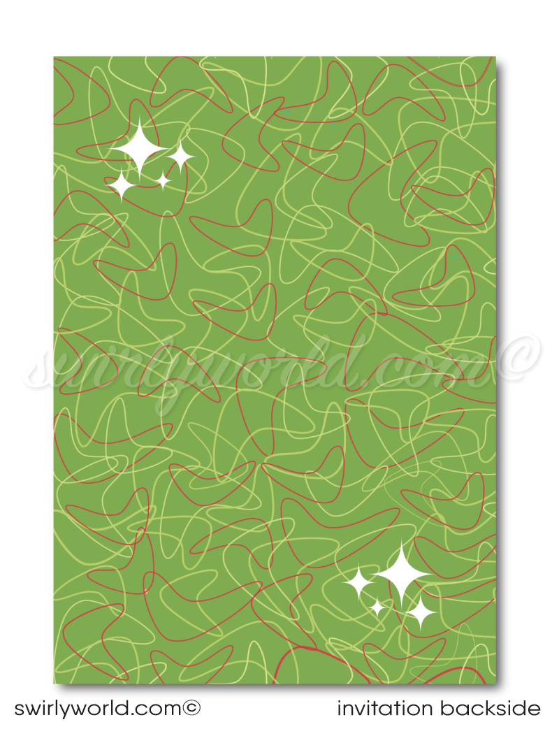 Customize all wording effortlessly on the Corjl app, ensuring a personalized touch. We take care of the printing process and deliver to your doorstep, making it a hassle-free experience. For an added touch of sophistication, upgrade your invites with our custom printed matching envelopes. Celebrate the magic of the season in style, and if you adore the timeless appeal of 1950s MCM vintage design, these invitations are tailor-made for your upcoming festivities. Make a statement with invitations that reflect your unique style and leave a lasting impression on your guests.