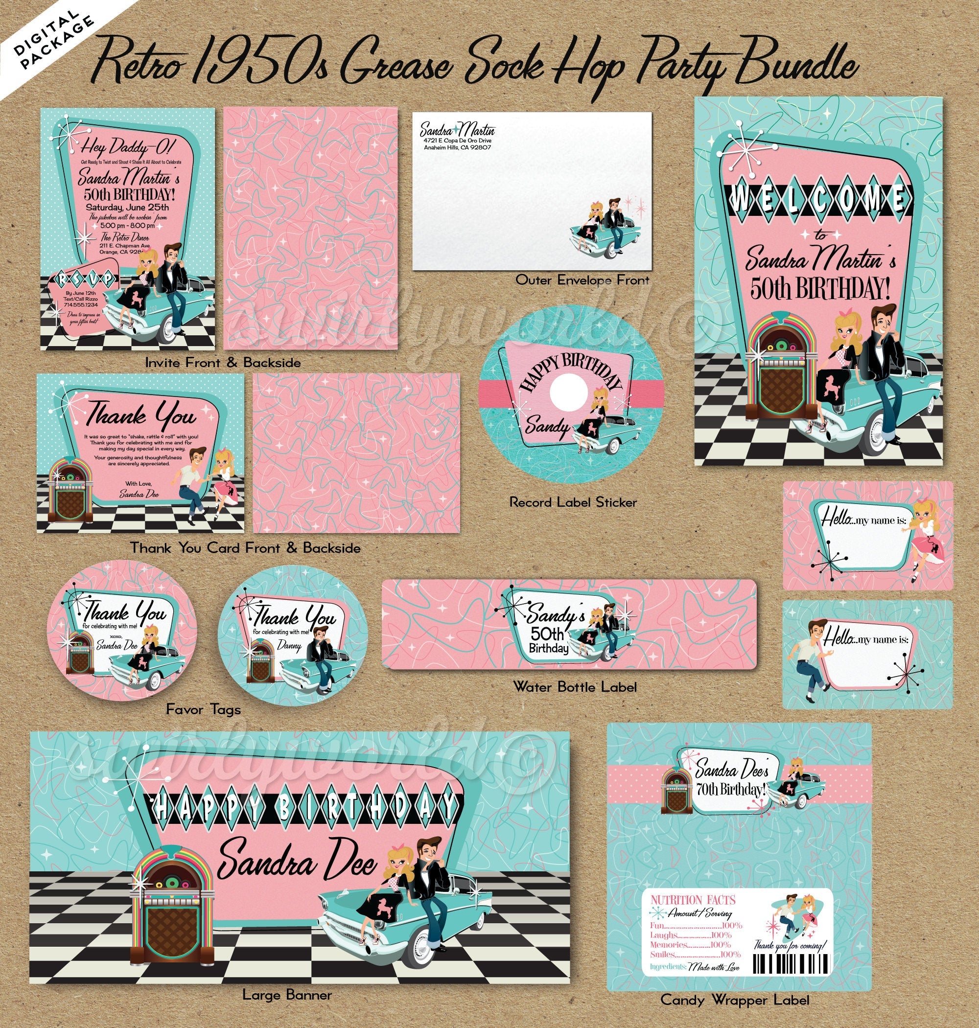 Digital 1950's Grease Pink Ladies Retro Sock Hop Poodle Skirt Fifties Party Bundle Pack. Retro Rockabilly Pink and Aqua Blue 1950's Party!