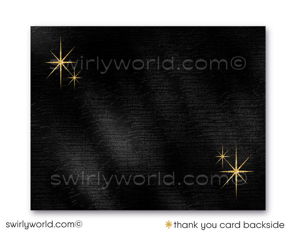 At the heart of this eye-popping design is a clever play on words, with a charmingly cute diamond ring replacing the letter "O" in "I Do," symbolizing the promise of forever in the most adorable way. The theme is brought to life against a dramatic black background, creating a stunning contrast that makes every detail pop. The wording shines brightly in a glittering gold text effect accented by sparkling white starbursts, reminiscent of vintage glamour and sophistication, adding an extra layer of allure to your invitation.