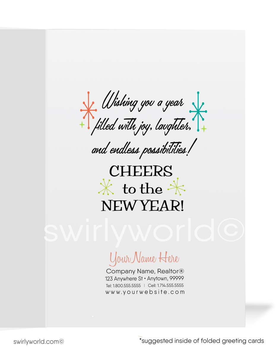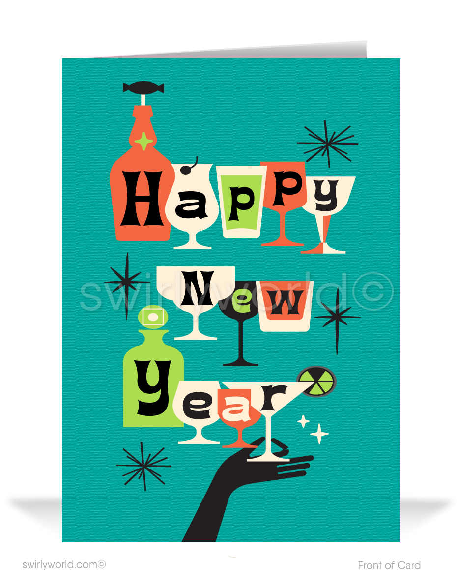 Step into the nostalgia of the atomic era with our Retro Mid-Century Modern Happy New Year Greeting Cards. Inspired by the vibrant aesthetics of the 1950s-1960s, these cards showcase authentic starbursts and retro typography, making them the perfect pick for lovers of timeless vintage style. This exclusive design features a playful arrangement of atomic mod-style bottles and martini glasses, creatively forming the letters "Happy New Year" in geometric retro typography. Adorned with iconic starbursts and a classic MCM color palette of teal, orange, and pea green, these cards radiate mid-century charm.