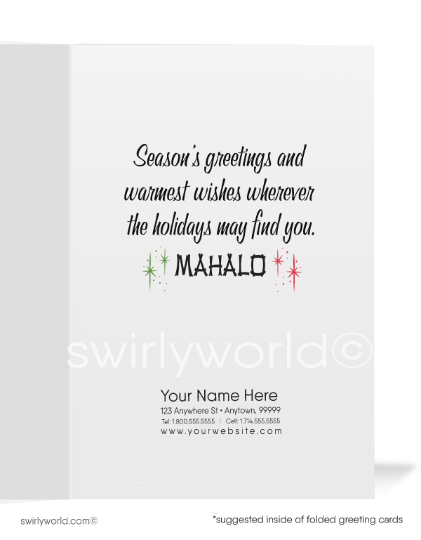 Happy Huladays! Transport yourself to the vibrant 1950s-1960s with this kitschy holiday greeting card. Featuring a retro mid-century design, it showcases a vintage Hawaiian hula girl serenading on the beach with her ukulele beneath a swaying palm tree. Mid-century ornaments hang in the scene, set against a warm pink sunset with the word 'Aloha' shimmering on the sparkling sea. This card beautifully blends holiday cheer with tropical charm.
