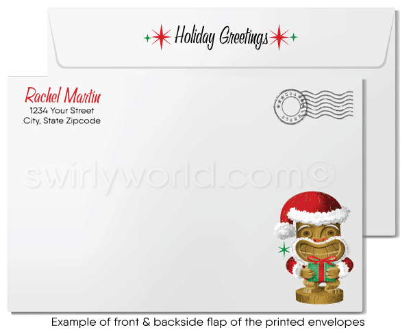 Choose between a sleek single-panel flat card or a classic folded option for a timeless look. Both come with matching white envelopes, with an option to upgrade to custom imprinted envelopes featuring your name, return address, and coordinating design elements. Let these distinctive, retro holiday cards make a lasting impact and elevate your holiday greetings.