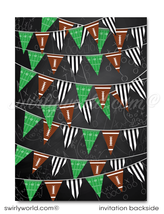 Kick off your football-themed party with a winning touch using our Football Party Invitations, Thank You Cards, and Envelopes set. This expertly printed ensemble sets the stage for a touchdown-worthy celebration with a dynamic design that features festive sports flags, a detailed helmet, and a classic football, all set against a chalkboard background that mimics a green football field. It’s like bringing the excitement of game day right into your invitations.