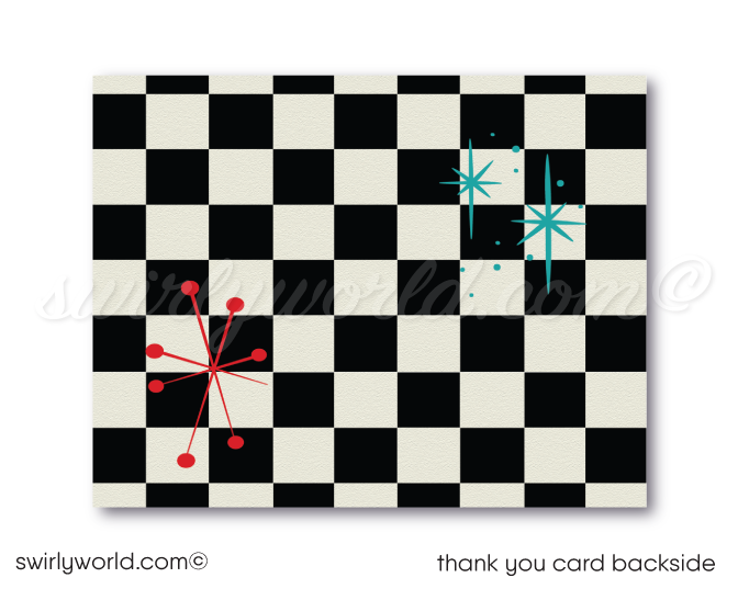 Let's Go Bowling! Step back in time to the vibrant 1950s with our stunning Retro Rockabilly Bowling Birthday Party printed invitation set, featuring a striking red and aqua blue color scheme with a black and white checkered pattern. This design brings to life a stylishly retro couple, the epitome of 1950s chic. The gal dazzles in her era-defining poodle skirt and saddle shoes, her hairstyle paying homage to the iconic looks of the decade. Her rockabilly clad beau exudes coolness in a black leather jacket, perfectly cuffed blue jeans emblematic of the 50s, and a sleek pompadour. Together, they're captured in a moment of timeless style, leaning against a classic 1957 Chevy car in aqua blue, an embodiment of the era's automotive elegance.