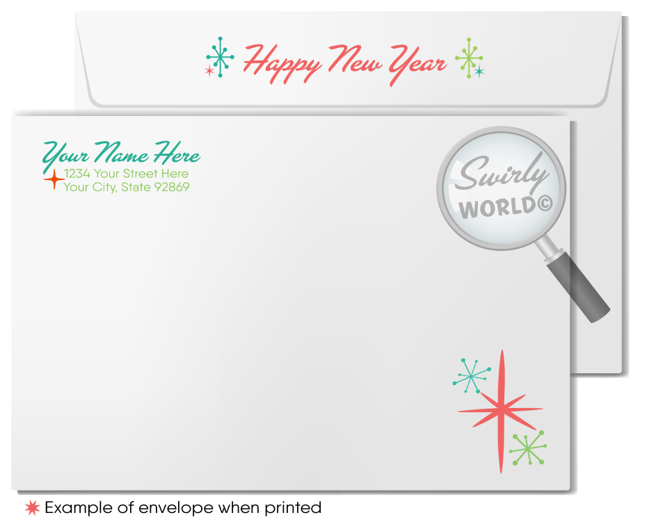 Cheers for the New Year! Transport yourself to a bygone era with our chic and swanky Happy New Year card, embracing the captivating charm of mid-century modern vintage style. This digital download brings nostalgia and whimsy to life, featuring an iconic MCM boomerang motif adorned with captivating geometric shapes and starbursts in classic mid-century colors.