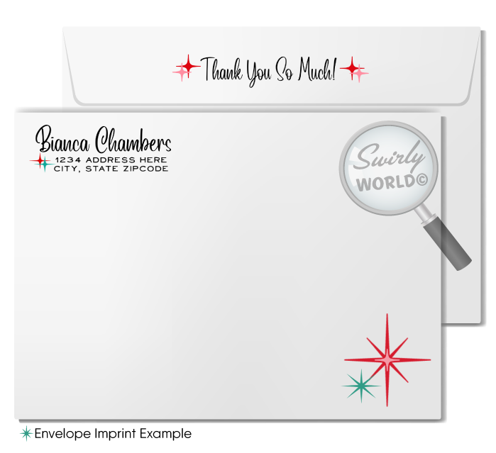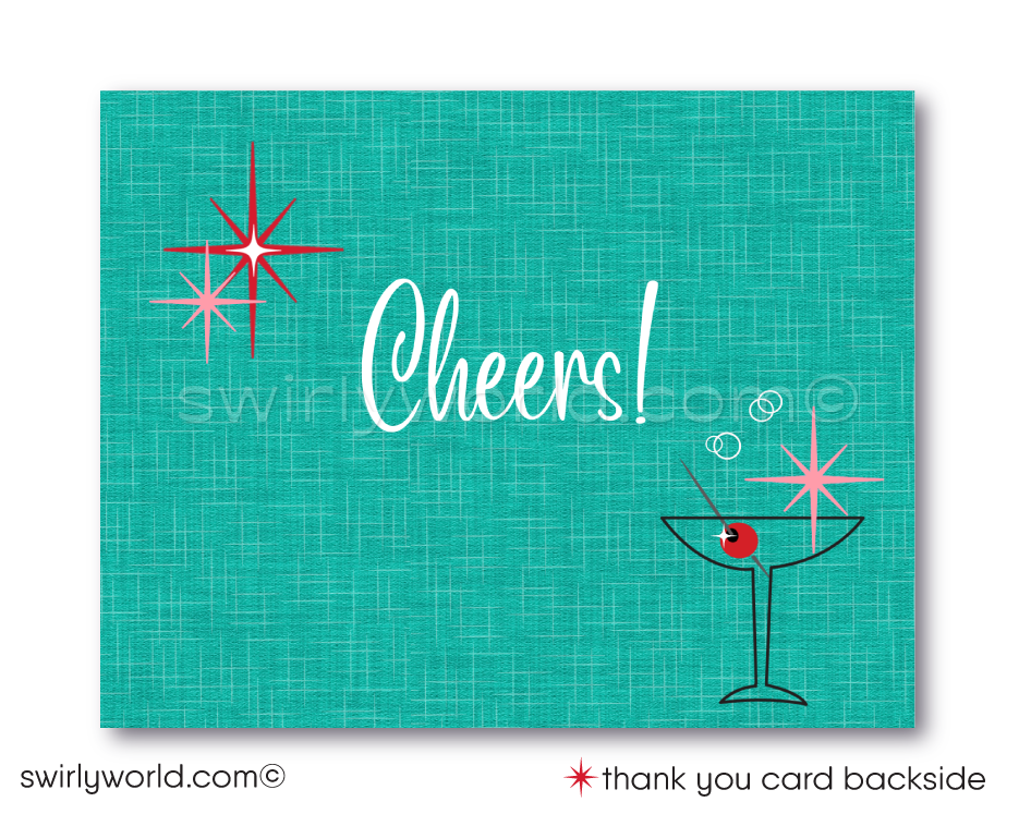 Step into the vibrant world of mid-century modern retro glamour with our Rockabilly Pin-up Girl in a Martini Glass-themed birthday invitation and thank you card set. Perfect for those with a deep appreciation for the iconic Rockabilly style, this set promises to start your celebration on a note of vintage chic and undeniable flair. The invitation features a captivating retro pinup girl, gracefully perched in a martini glass, embodying the spirit of 1950's pin-up charm. Surrounded by retro starbursts and complemented by mid-century modern style fonts, the design captures the essence of the era perfectly.