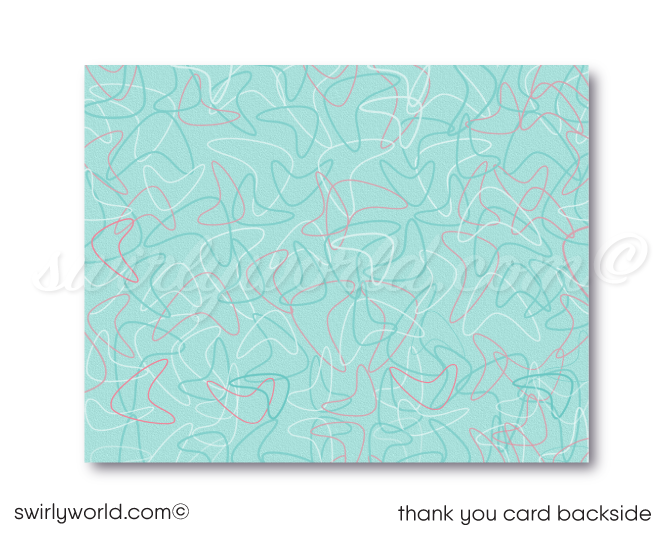 Plunge into the enchanting world of the 1950s with our "Grease" Pink Ladies-inspired Poodle Skirt Sock Hop Birthday Party printed invitation collection. At the heart of this delightful design lies a charming pink skirt adorned with a classic black poodle and the timeless saddle shoes, set against a backdrop of a black and white checkered floor accentuated with powder pink and blue starbursts. The invitation's reverse side captivates with a vintage jukebox amidst whimsical boomerang shapes, evoking the quintessential 1950s vibe.