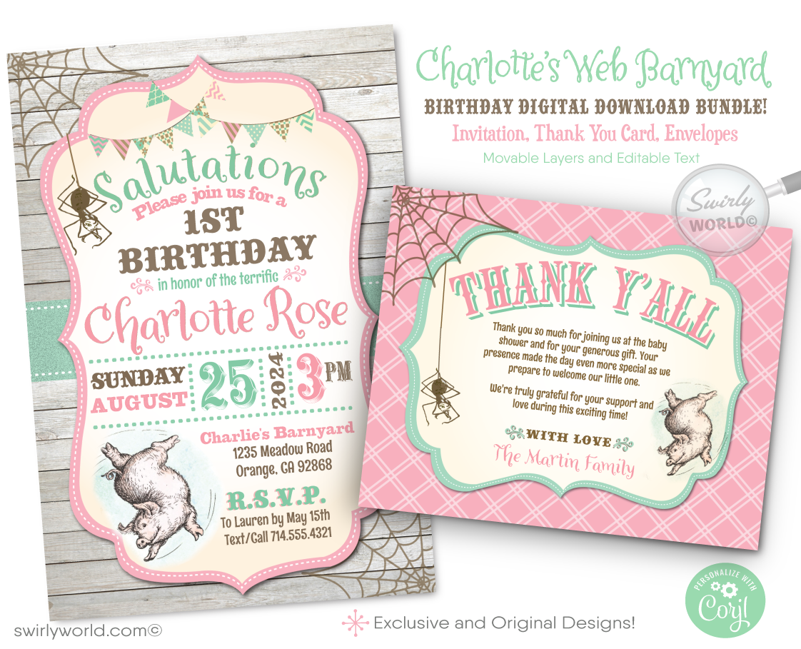 Embrace the charm of a timeless classic with our Charlotte's Web 1st Birthday Party Digital Downloadable Set, designed to celebrate the first birthday of your little one with a heartwarming barnyard theme. This enchanting collection captures the spirit of the beloved characters from E.B. White's iconic tale, including Wilbur the Pig, Fern, Templeton, and Charlotte the Spider, offering a unique and nostalgic touch to your baby's first birthday party.