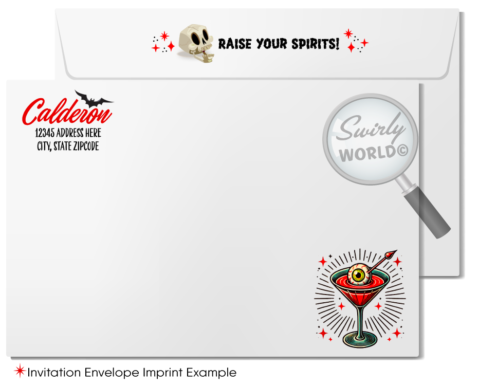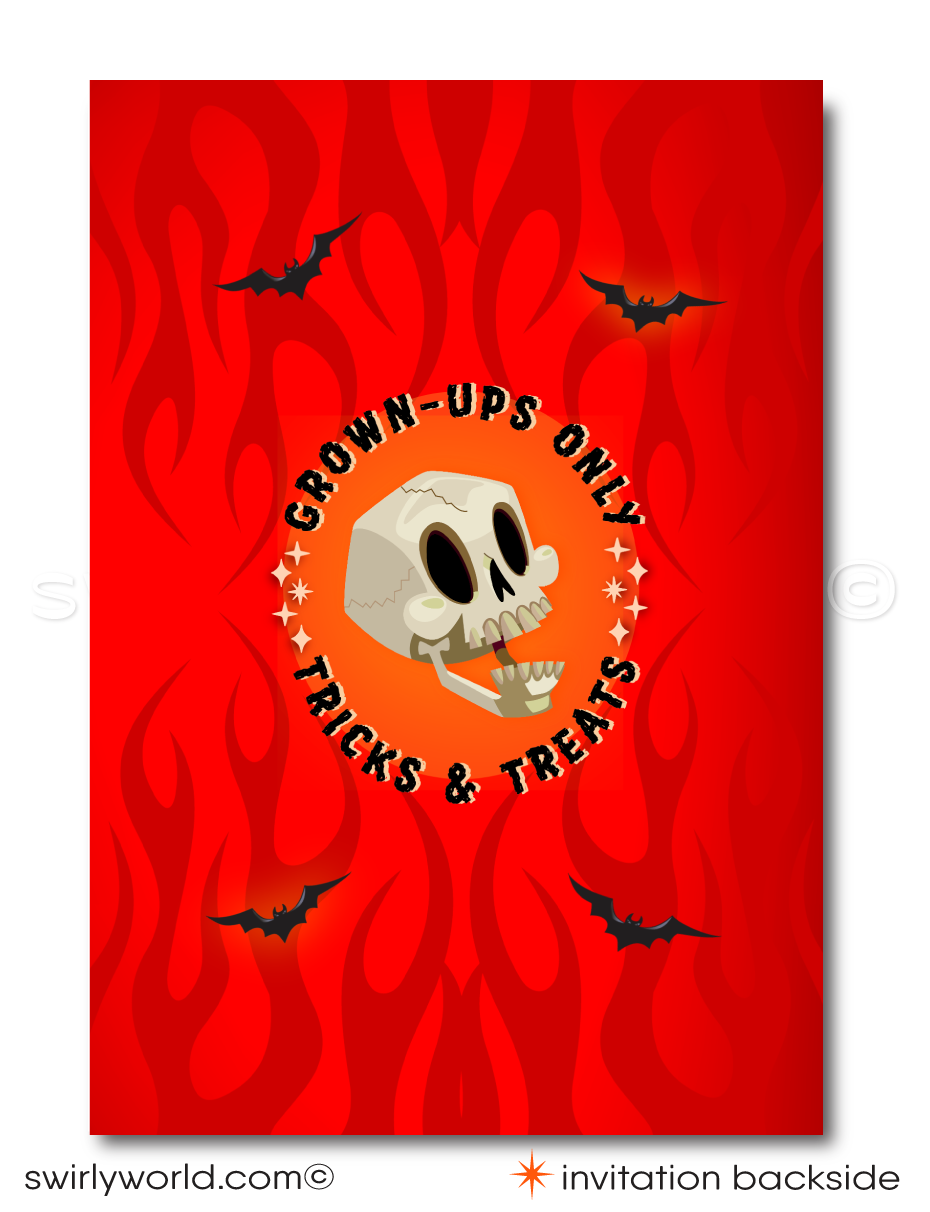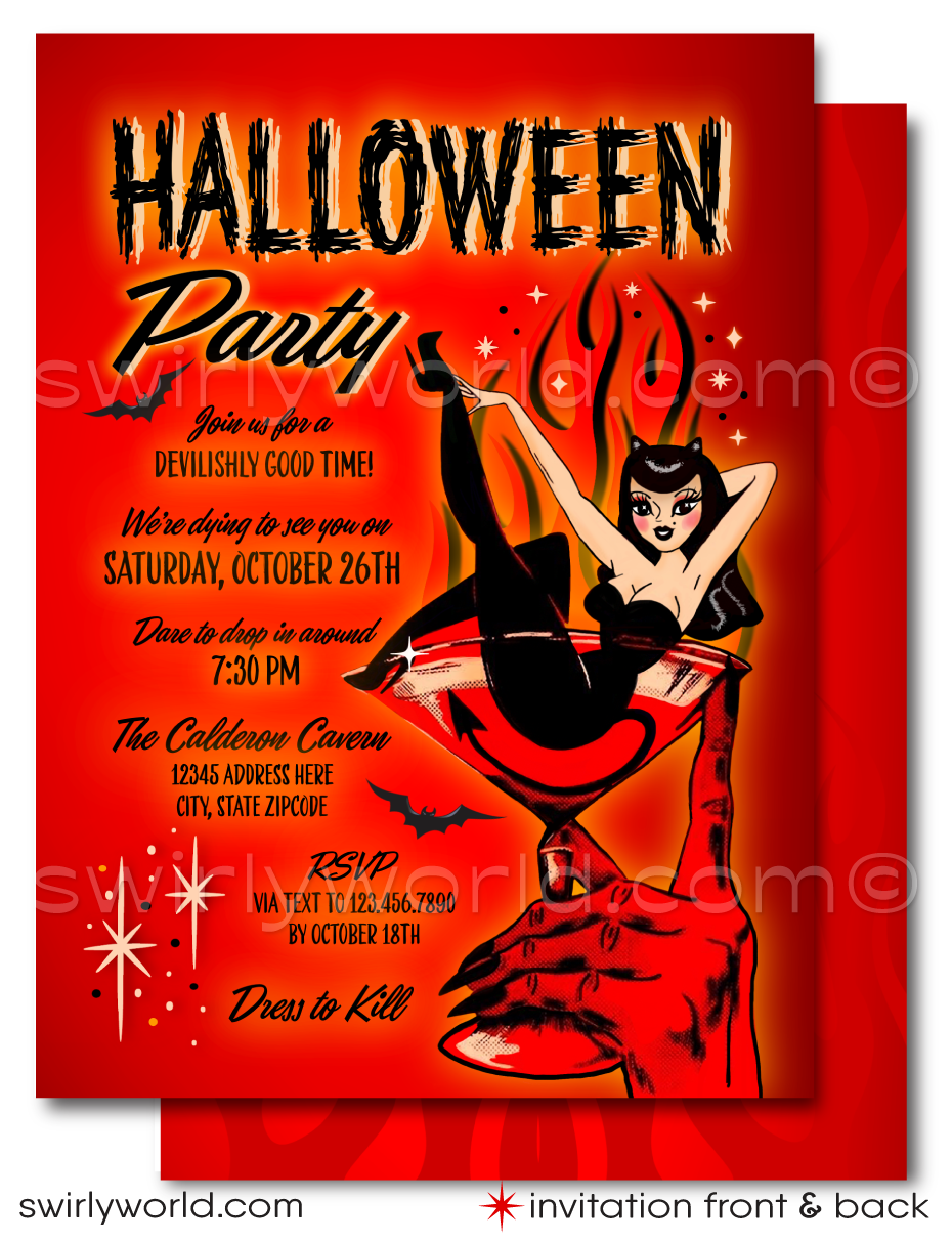 Elevate your "Boo's and Booze" Halloween cocktail party with our expertly crafted invitation, designed to set the perfect tone for your spooky soirée. Featuring a devilish hand gripping a martini glass filled with a blood-red cocktail, surrounded by flames and bats, this invite embraces vintage tattoo-style art. A retro rockabilly pinup girl with striking black hair poses seductively in the martini glass, creating a captivating and thrilling visual that’s sure to enchant your guests. Ideal for any Halloween gathering, whether intimate or grand, this invitation blends sophistication with sinister charm, making it the perfect choice for a hauntingly fun celebration.