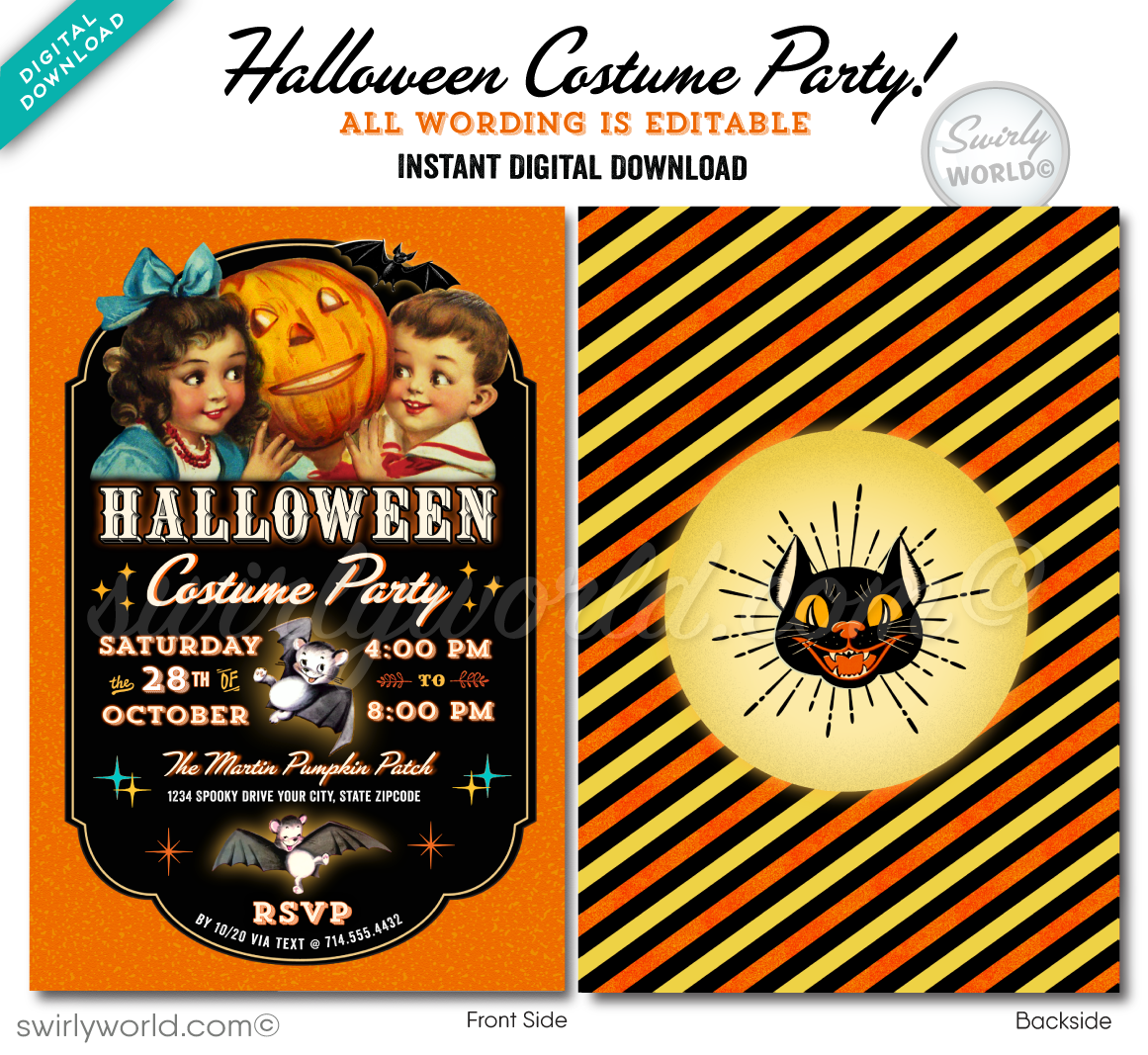 Transport yourself to an enchanting realm of nostalgia with our captivating digital download: the SPOOKTACULAR 1950s-inspired mid-century Vintage Halloween invitation and envelope set. These invitations are designed to infuse your event with the irresistible charm of a retro-themed bash. Picture a pair of cherubic characters beaming as they cradle a cheerful pumpkin, encircled by endearing anthropomorphic bats and an utterly adorable, mischievously cute black cat. If you have a soft spot for the timeless elegance of the classic 1940s-50s aesthetic, this Halloween invitation is an essential addition to your collection.