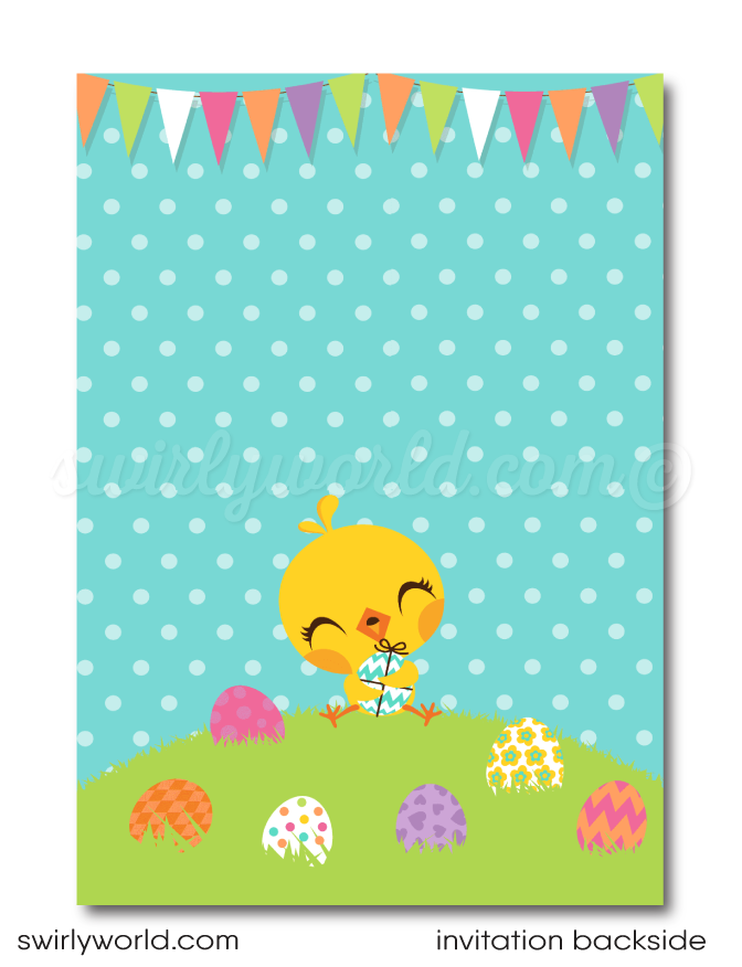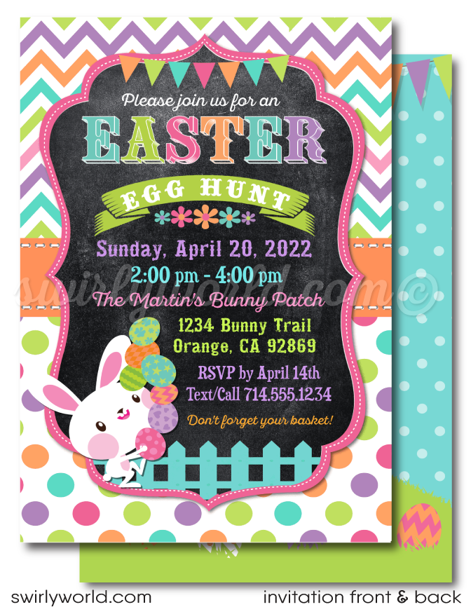 This adorable Easter Egg Hunt party invitation is a perfect choice if you are planning an upcoming Easter Egg Hunt celebration! Darling colored eggs and a precious little bunny juxtaposed on a vintage chalkboard background makes this Easter Egg Hunt theme party invitation truly spectacular!