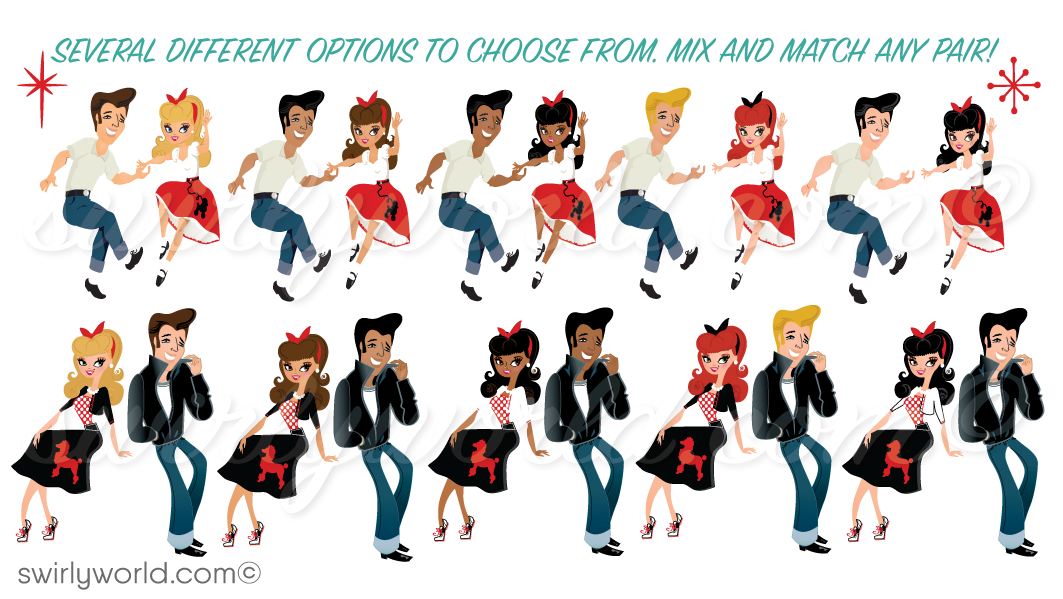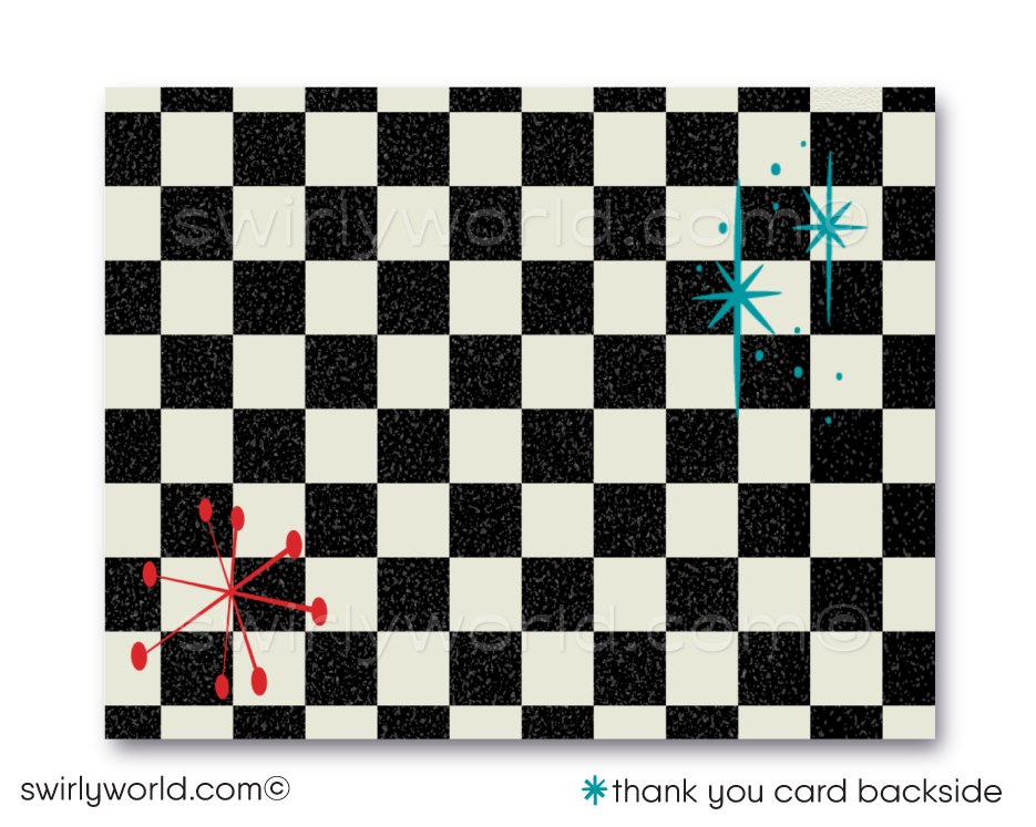 Dive into the nostalgic charm of the 1950s with our Retro Mid-Century Bowling Theme Engagement Party Invitation Set, designed for couples who cherish the unique flair and celebratory spirit of this bygone era. This captivating set, embodying the essence of 1950s aesthetics with a modern twist, includes invites, thank you cards, and corresponding envelopes, all featuring a retro atomic mod design. At the heart of this design is an illustration of a rockabilly style couple seated on a classic 1957 Chevy car, alongside a playful illustration of a bowling pin and ball, with an engagement ring elegantly wrapped around the bowling pin. This imagery sets the scene for a love story that's as timeless and stylish as the era it celebrates. Feel free to change the characters with different hair, eye, and skin colors.