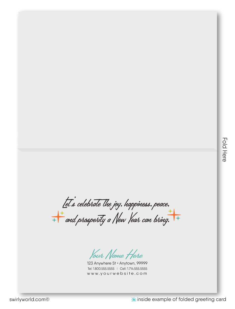 Celebrate the New Year with a touch of timeless elegance through our Retro Mid-Century Modern Happy New Year Greeting Cards. Inspired by the vibrant aesthetics of the 1950s and 1960s, these exclusive cards showcase authentic starbursts and retro typography, capturing the iconic charm of the atomic era. Featuring a stylish abstract firework design in classic MCM hues of aqua blue, orange, and green, these cards are perfect for those who cherish vintage sophistication.