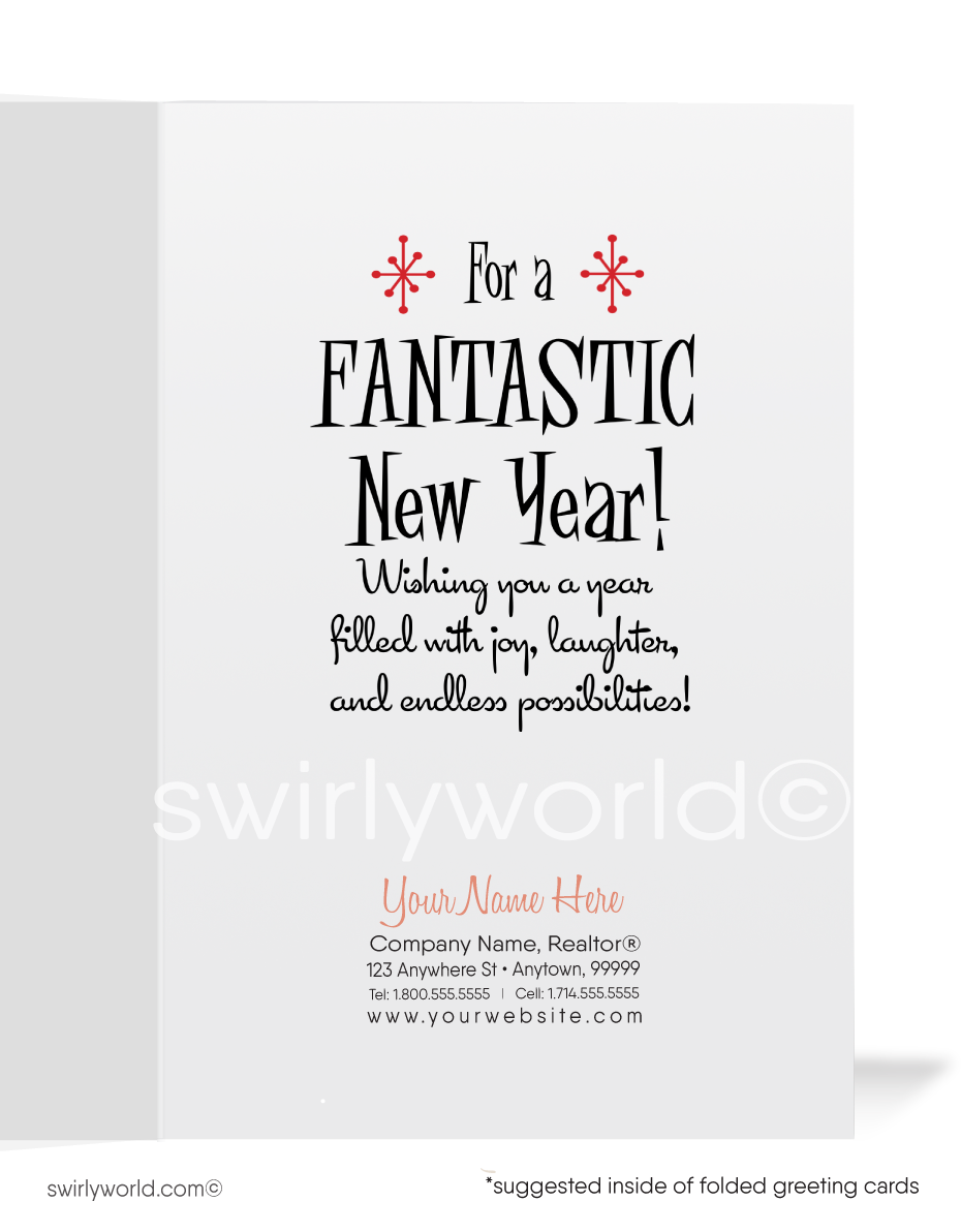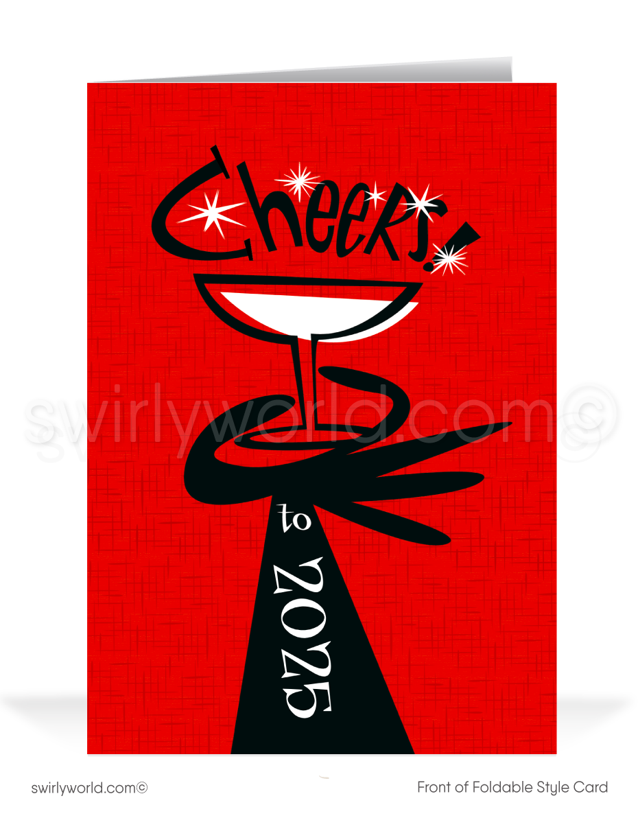 Celebrate the timeless charm of the past with our Retro Mid-Century Modern Happy New Year Greeting Cards. Inspired by the bold aesthetics of the 1950s-1960s, these cards showcase authentic starbursts and retro typography, making them a must-have for lovers of atomic-era style. This unique design features a vintage-inspired hand elegantly holding a martini glass, topped with the word "Cheers" in classic retro lettering, all set against a striking red backdrop accented with atomic starbursts.