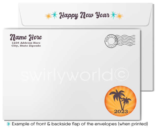 Embrace the nostalgia of the past with our Retro Beach-Themed Happy New Year Greeting Cards. Inspired by the vibrant aesthetics of the 1960s-1970s, these groovy cards showcase vintage typography spelling "Happy New Year," paired with a stunning sunset scene and a tropical palm tree swaying over a serene blue-green ocean. The retro design and soothing colors evoke a peaceful, timeless vibe perfect for celebrating the season.
