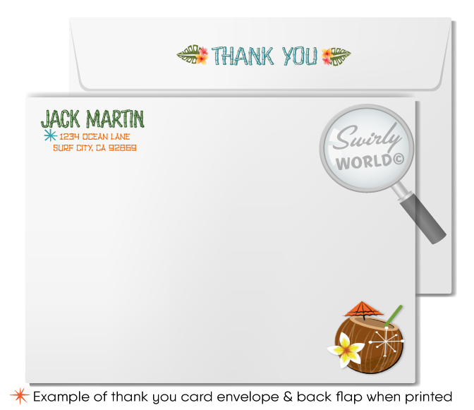 Picture yourself chillin' out on the beach in a classic Woody Station wagon, surfboard strapped on top, ready for a day of sun, surf, and endless fun. The front of the invite captures this iconic scene against a backdrop of a tropical Hawaiian island beach, complete with swaying palm trees, rolling waves, and the watchful gaze of a tiki god. And what's a luau without a refreshing coconut cocktail? An image of a coconut cocktail glass adds the perfect touch of tropical flair to the design.