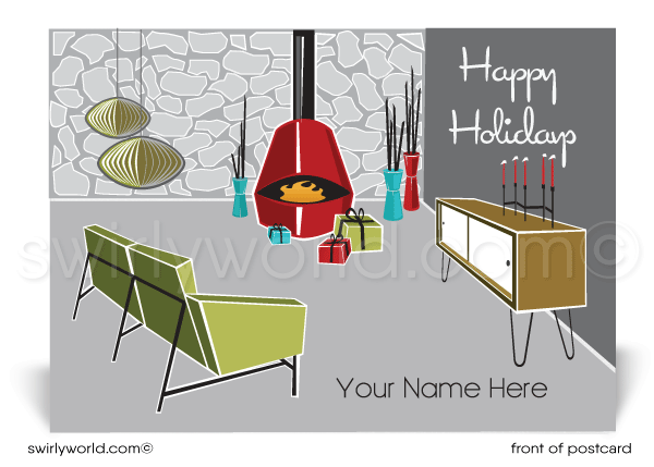 Retro Modern Mid-Century Living Room Furniture Design on Holiday Christmas Postcard.