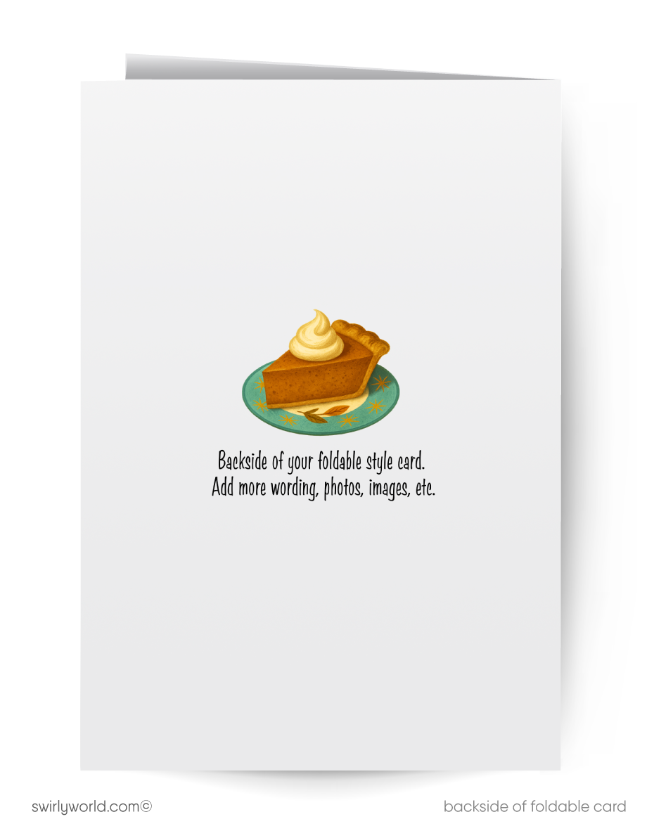 Take a delightful journey back to the 1950s-1960s with our vintage Happy Thanksgiving cards. Embracing the flair of that era, these mid-century style cards capture the essence of the beloved holiday with retro fall elements. This vintage Thanksgiving card design features two children peering into an oven to admire a succulent turkey baking in the oven. Meticulously crafted, they strike a perfect balance between nostalgia and elegance, offering a unique way to express your Thanksgiving greetings.