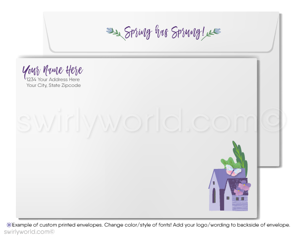 This whimsical design features a picturesque spring garden adorned with blooming violet flowers surrounding a quaint white picket fence with an arched entryway. A classic white Adirondack chair rests on the lush green grass, evoking a sense of calm and charm. To the left of the arched gate, the words “Happy Spring” are written in cheerful, retro-style purple calligraphy. A realtor signpost in the front yard offers the perfect space to showcase your company logo or custom branding. This bright and seasonal design blends professionalism, warmth, and vintage flair—perfect for making a meaningful impression this spring.