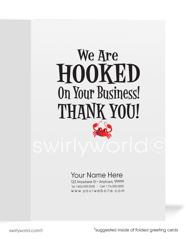 These "Hooked on Your Business" Thank You Cards make it easy to show your loyal customers your appreciation. The unique cartoon style and funny message will leave a lasting impression of gratitude. Show them you're hooked on their business with these convenient, printed and shipped cards.