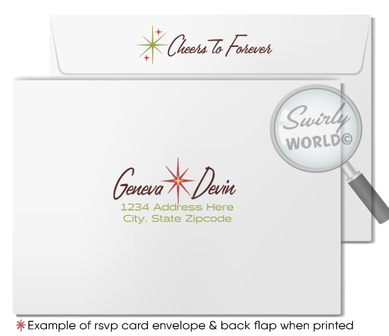 Step back in time and embrace the playful spirit of the 1960s with our Tiki Surf-themed Mad Men style wedding invitations. Perfect for couples who adore the mid-century modern aesthetic, this wedding invitation set captures the essence of the era with its dynamic blend of atomic starbursts, whimsical amoeba shapes, and striking geometric patterns.
