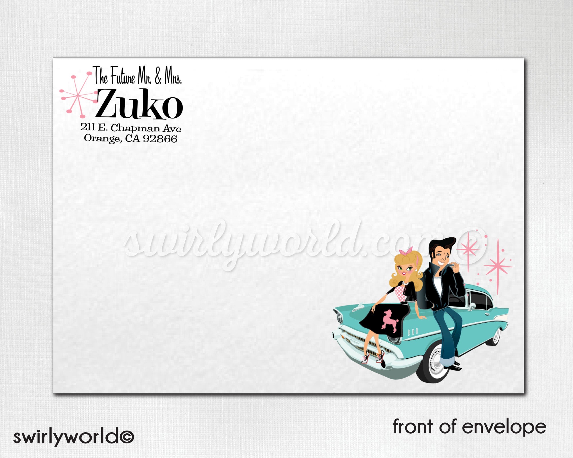 Your downloadable wedding bundle includes everything you need to set the tone for your sock hop-inspired celebration, from the invitation and RSVP card to matching envelopes and more. With its chic and on-trend designs, this bundle is the perfect choice for couples looking to add a touch of retro flair to their special day.