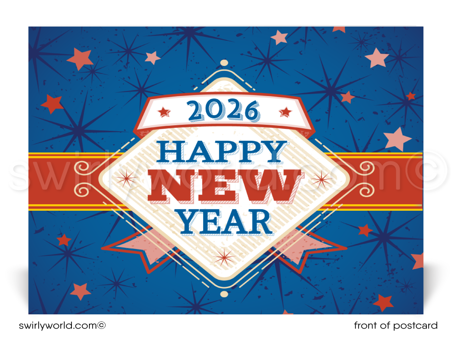 Exclusive Happy New Year 2026 Postcards with Patriotic Red, White, and Blue Design, Starbursts, Bold Typography, and Customizable Backside