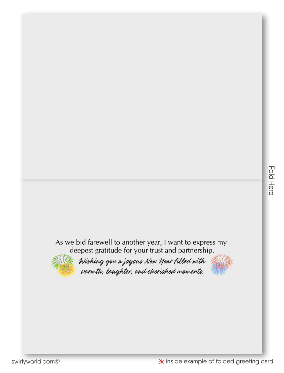 Our commitment to excellence is evident in the details – these cards are expertly printed on premium matte card stock, ensuring a luxurious look and feel that leaves a lasting impression. With our upgraded envelope option, we will print your name, logo, and even add a matching image from the front of the card design directly onto the envelopes. This thoughtful detail not only saves you time but also elevates the entire presentation, making your New Year's greetings truly stand out.