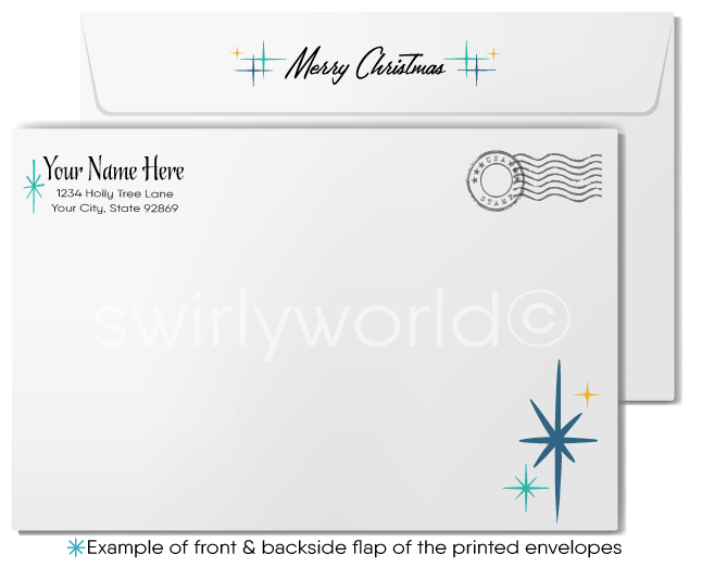 Printed on premium matte finish greeting card stock, each card showcases authentic mid-century modern typography and an elegant MCM Christmas design that captures the essence of the era. Choose between a sleek single-panel flat card or a folded Christmas card option, both accompanied by matching white envelopes. For a personalized touch, upgrade to custom Christmas cards with imprinted envelopes featuring your name, return address, and coordinating design elements.
