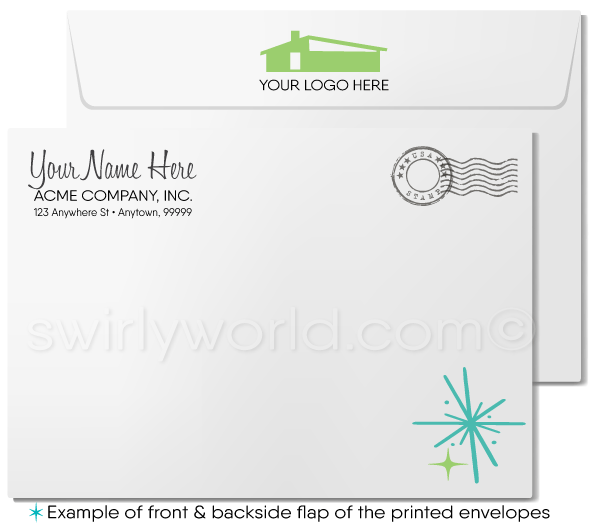 We expertly print on thick 16pt card stock, ensuring a premium feel that complements the vintage design. Each card comes with a blank white envelope, ready for your personal message. Choose from the classic old-school folded style greeting card or opt for a budget-friendly single-paneled "Flatcard" option. For an added touch of personalization, upgrade to custom printed envelopes featuring your name, return address, and logo. Whether you're sending thanks to friends, family, or clients, our retro mid-century modern Thank You card delivers a heartfelt message with a stylish flair.