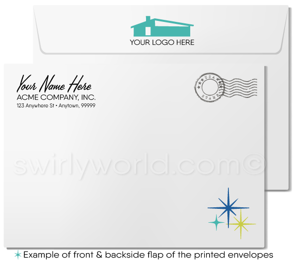 We expertly print on thick 16pt card stock, ensuring a premium feel that complements the vintage design. Each card comes with a blank white envelope, ready for your personal message. Choose from the classic old-school folded style greeting card or opt for a budget-friendly single-paneled "Flatcard" option. For an added touch of personalization, upgrade to custom printed envelopes featuring your name, return address, and logo. Whether you're sending thanks to friends, family, or clients, our retro mid-century modern Thank You card delivers a heartfelt message with a stylish flair.
