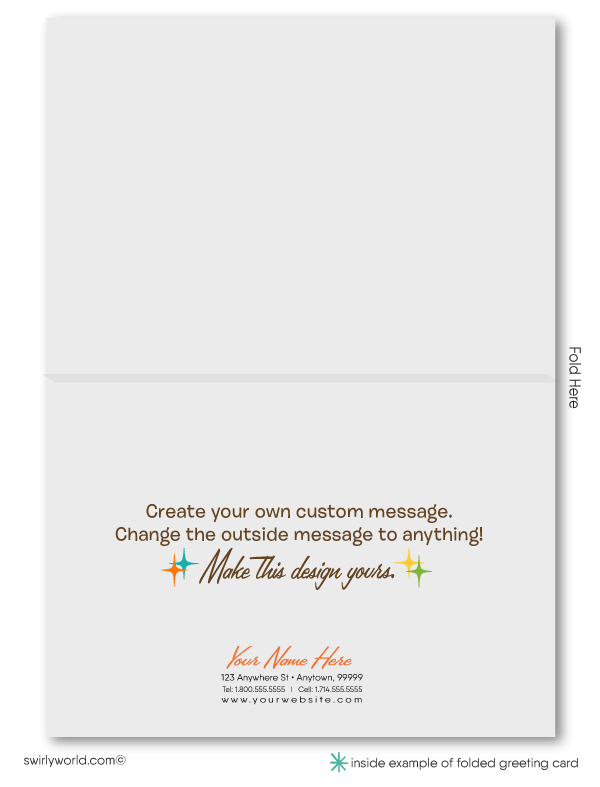 We expertly print on thick 16pt card stock, ensuring a premium feel that complements the vintage design. Each card comes with a blank white envelope, ready for your personal message. Choose from the classic old-school folded style greeting card or opt for a budget-friendly single-paneled "Flatcard" option. For an added touch of personalization, upgrade to custom printed envelopes featuring your name, return address, and logo. Whether you're sending thanks to friends, family, or clients, our retro mid-century modern Thank You card delivers a heartfelt message with a stylish flair.
