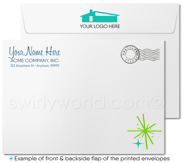 We expertly print on thick 16pt card stock, ensuring a premium feel that complements the vintage design. Each card comes with a blank white envelope, ready for your personal message. Choose from the classic old-school folded style greeting card or opt for a budget-friendly single-paneled "Flatcard" option. For an added touch of personalization, upgrade to custom printed envelopes featuring your name, return address, and logo. Whether you're sending thanks to friends, family, or clients, our retro mid-century modern Thank You card delivers a heartfelt message with a stylish flair.