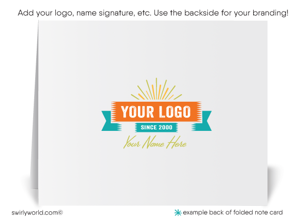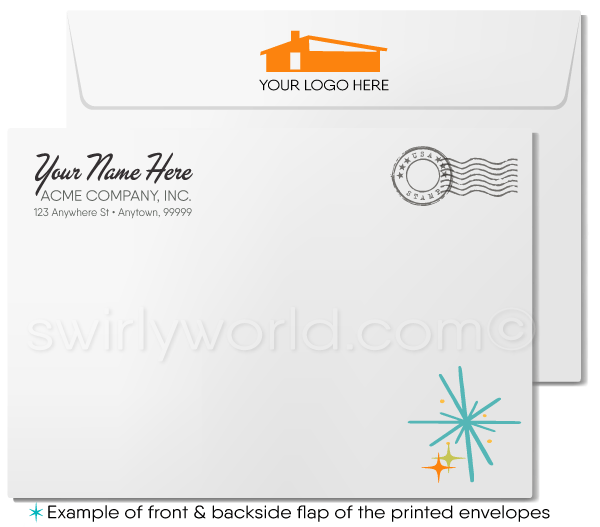 We expertly print on thick 16pt card stock, ensuring a premium feel that complements the vintage design. Each card comes with a blank white envelope, ready for your personal message. Choose from the classic old-school folded style greeting card or opt for a budget-friendly single-paneled "Flatcard" option. For an added touch of personalization, upgrade to custom printed envelopes featuring your name, return address, and logo. Whether you're sending thanks to friends, family, or clients, our retro mid-century modern Thank You card delivers a heartfelt message with a stylish flair.