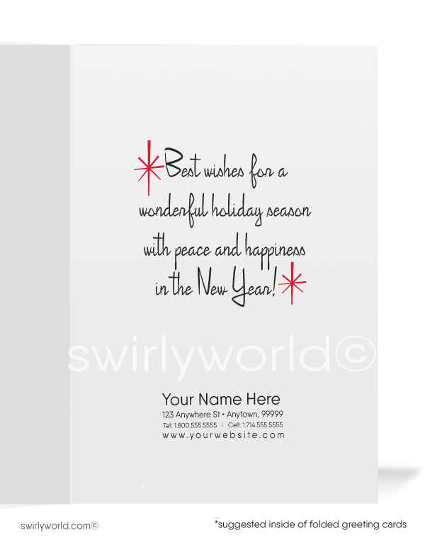What makes our cards stand out is the authentic mid-century typography, immersing you in the retro era and adding a unique charm to your holiday greetings. Personalize the message on these unique cards and envelopes for a truly memorable impression on your recipients. Printed on premium matte stock, these cards and envelopes stand as a symbol of quality and style.