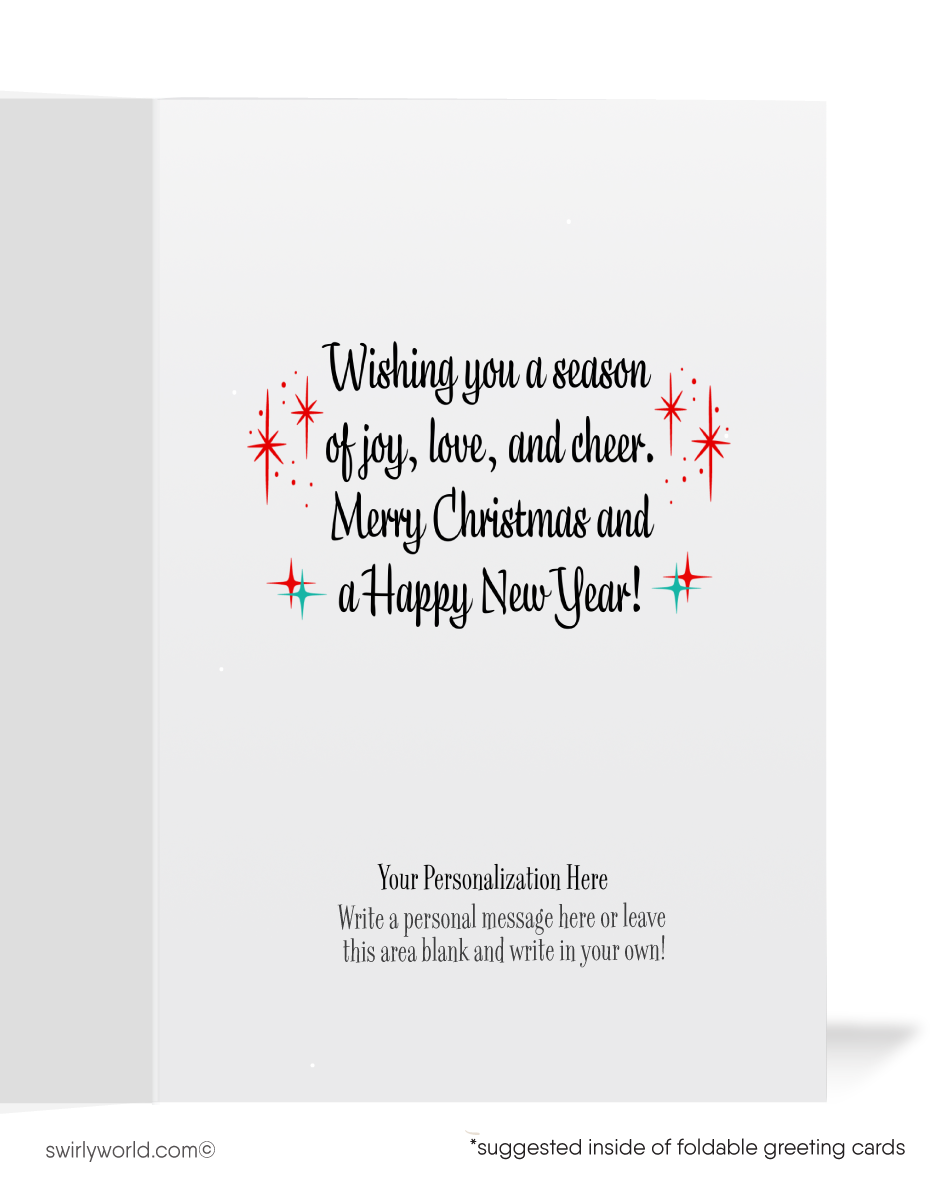 Our cards pop with authentic mid-century typography that brings the retro vibe to life, adding a one-of-a-kind charm to your holiday greetings. Make it personal with a custom message on these unique cards and envelopes for a warm, memorable touch. Printed on premium matte stock, these cards are all about quality and aesthetic, ready to impress.