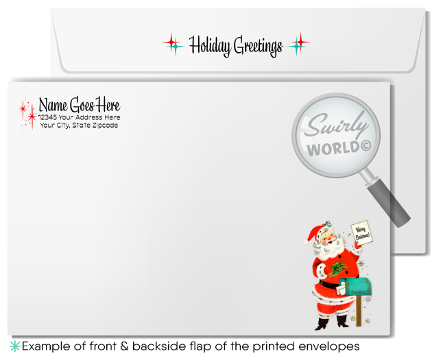 Choose between a sleek single-panel flat card or a classic folded option for a timeless look. Both come with matching white envelopes, with an option to upgrade to custom imprinted envelopes featuring your name, return address, and coordinating design elements. Let these distinctive, retro holiday cards make a lasting impact and elevate your holiday greetings.