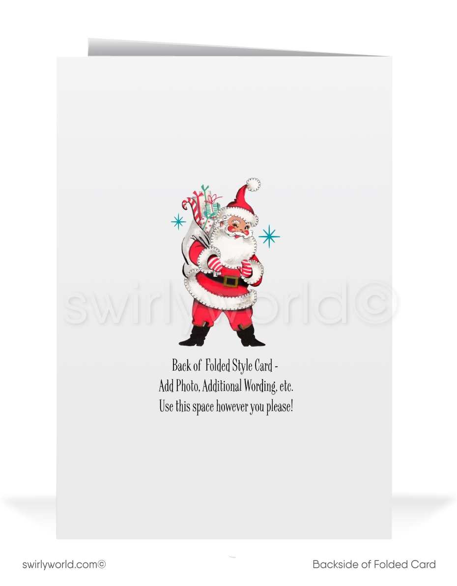 Take a journey to the past with our exclusive vintage Christmas holiday card, designed to capture the timeless warmth and nostalgia of a cherished bygone era. This one-of-a-kind card celebrates the magic of classic Christmas traditions, showcasing a charming 1950s-style Santa Claus on his sleigh, led by reindeer soaring over a picturesque neighborhood of snowcapped, quaint homes.