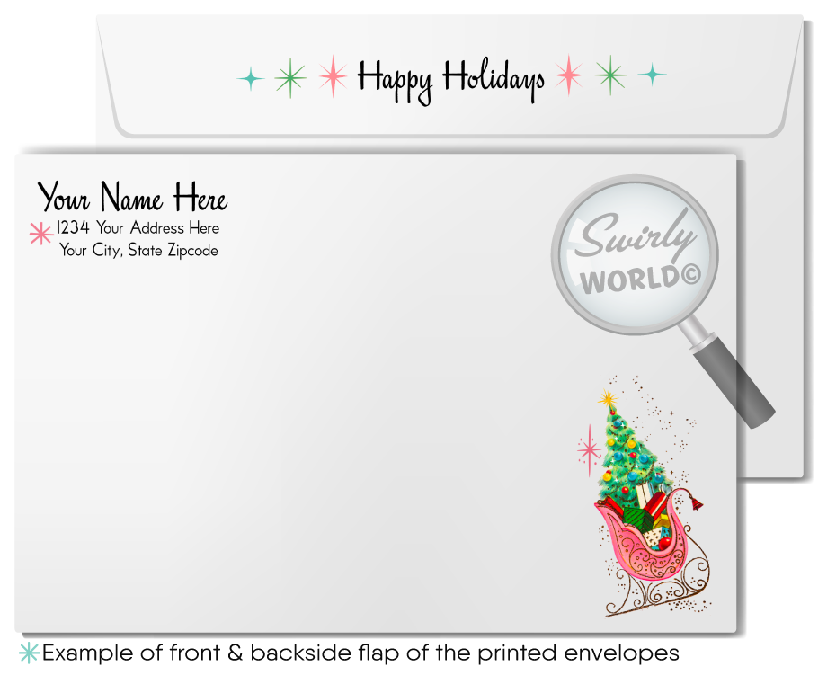 Choose between a sleek single-panel flat card or a classic folded option for a timeless look. Both come with matching white envelopes, with an option to upgrade to custom imprinted envelopes featuring your name, return address, and coordinating design elements. Let these distinctive, retro holiday cards make a lasting impact and elevate your holiday greetings.