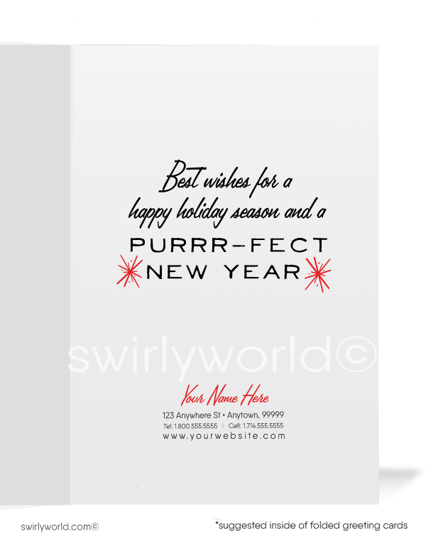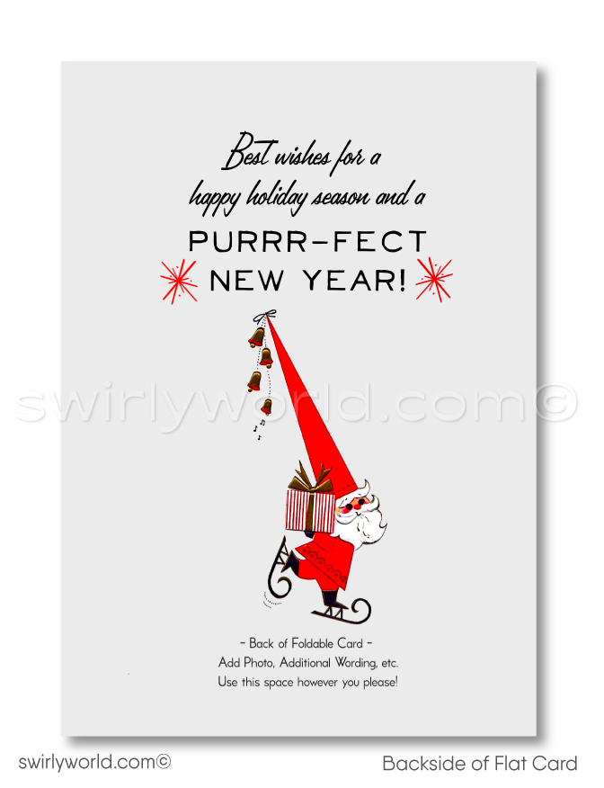 Take a nostalgic journey with our exclusive vintage Christmas holiday card, designed to capture the warmth and charm of a bygone era. This one-of-a-kind card celebrates classic Christmas traditions, offering a delightful glimpse into the magic of the season as it once was. Featuring an adorable "Meowy Christmas" kitty in Santa's hat and sleigh, this charming design embodies mid-century modern atomic style with playful holiday flair.