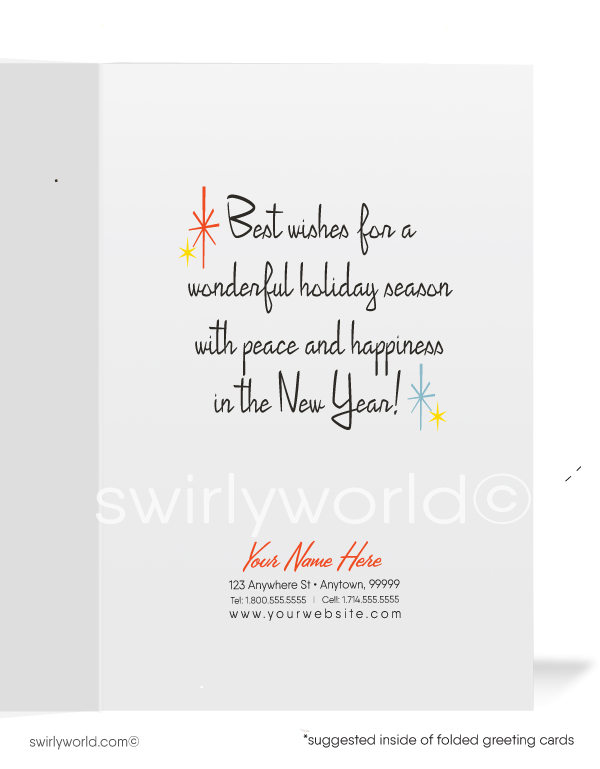 Our cards pop with authentic mid-century typography that brings the retro vibe to life, adding a one-of-a-kind charm to your holiday greetings. Make it personal with a custom message on these unique cards and envelopes for a warm, memorable touch. Printed on premium matte stock, these cards are all about quality and aesthetic, ready to impress.