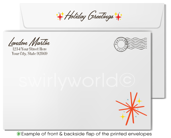 Choose between a sleek single-panel flat card or a classic folded option for a timeless look. Both come with matching white envelopes, with an option to upgrade to custom imprinted envelopes featuring your name, return address, and coordinating design elements. Let these distinctive, retro holiday cards make a lasting impact and elevate your holiday greetings.